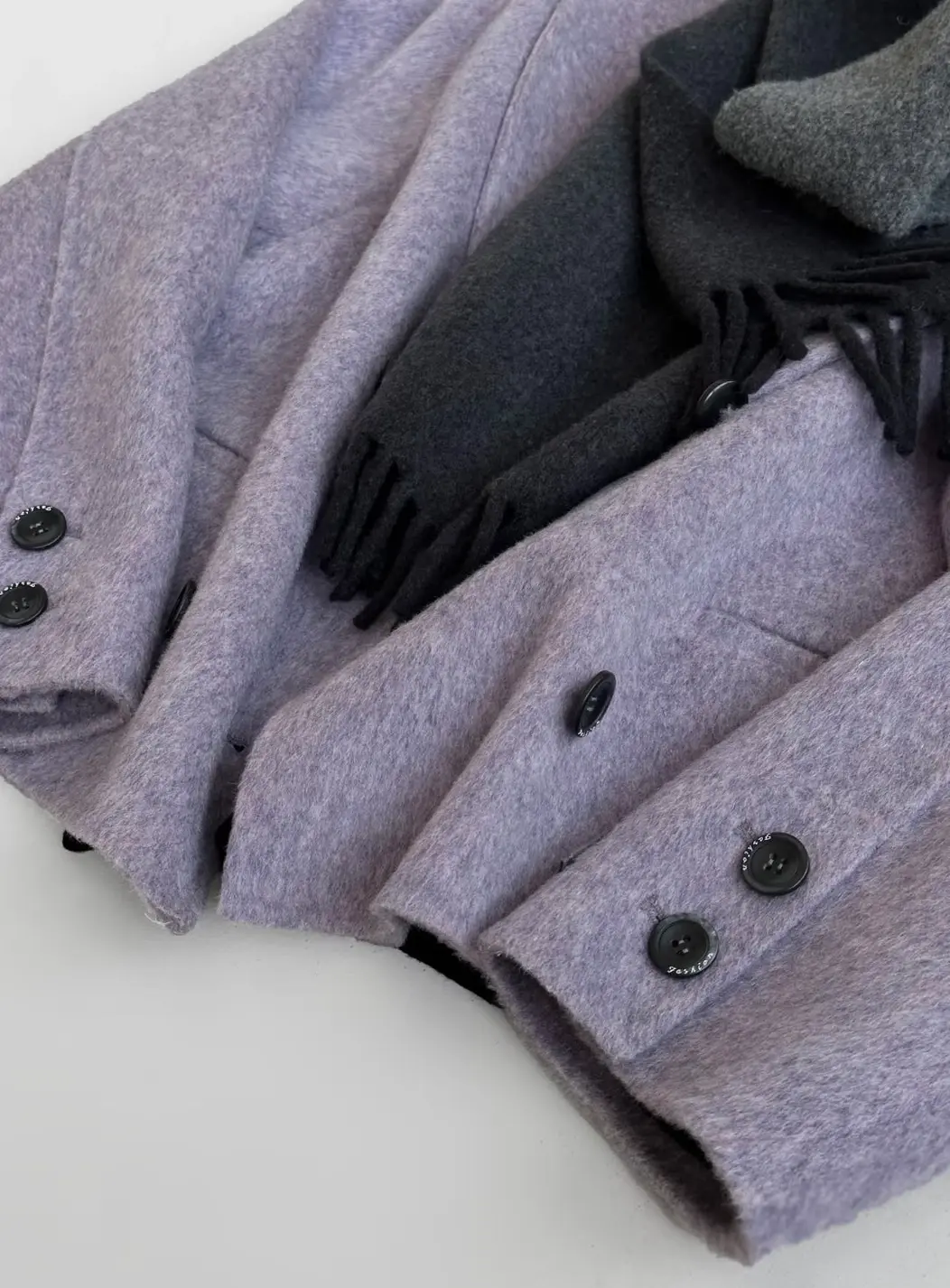 Its sculpted silhouette and lightweight yet warm wool fabric offer a delightful blend of structure and comfort. Perfect for refined everyday styling, this lavender coat will add a playful pop to any outfit. Embrace cozy elegance with this must-have piece!