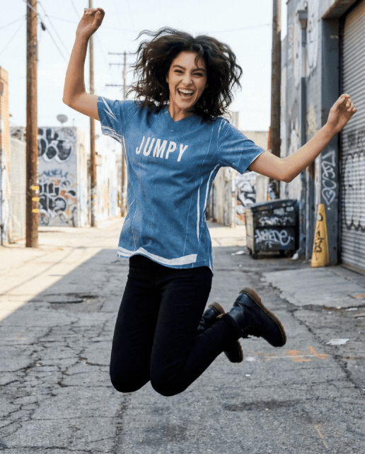 A full-length knit T-shirt with a high V neckline and an easy, expressive silhouette. The front features a bold “JUMPY” graphic, contrasted by an abstract, pipe-cleaner–inspired print that gives the piece a sense of movement and play. Short sleeves keep it grounded and wearable, while the overall composition feels distinctly art-driven.