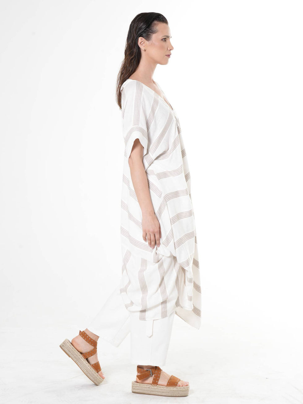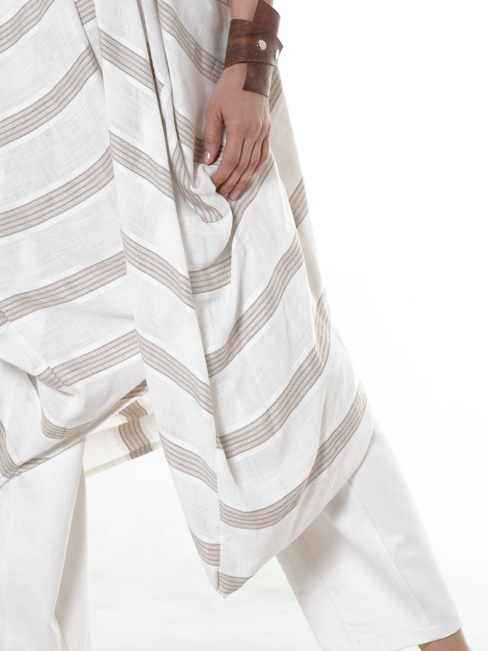 Dance through your day in this breezy, ethno-inspired draped tunic that feels like a summer breeze. The crinkled cotton-viscose blend keeps things cool while the avant-garde triangle back detail adds a cheeky surprise. Its oversized silhouette flows beautifully, making it the perfect partner for your favorite linen pants or adventurous boho layers. You’ll love the soft ivory and taupe stripes that bring a touch of worldly charm to your everyday streetwear.